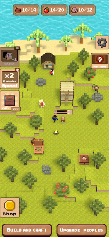 Сatch fish, look for apples and other food on the island to survive and upgrade your characters. Build a house and store food in it.