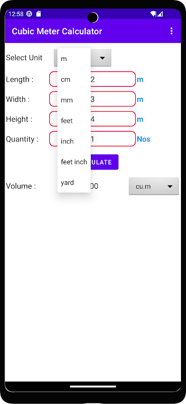 এই অ্যাপটি প্রদত্ত দৈর্ঘ্য, প্রস্থ, উচ্চতার জন্য ঘন মিটার ভলিউম গণনা করতে ব্যবহৃত হয়। আপনি মিটার, ফুট, ইঞ্চি, মিমি, সেমি, গজ ইত্যাদির মতো বিভিন্ন ইউনিটে দৈর্ঘ্য, প্রস্থ এবং উচ্চতা লিখতে পারেন এবং উত্তর আপনি কিউবিক মিটার, কিউবিক ফুট, কিউবিক ইয়ার্ড ইত্যাদিতে পাবেন।