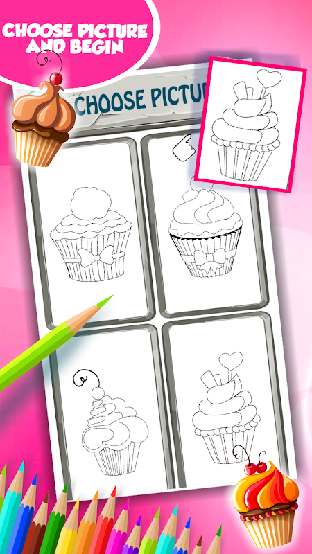 Have fun while you scroll through the collection of the coolest sketches presenting your favorite dessert. Download free the newest Cupcake Coloring Book app and let the pictures enchant you completely. Look at that magnificent whipped cream with shiny cherry which is your favorite fruit embellishing the sweetest cake with bow. Do not be confused when water runs to your mouth but tap on the paint bucket and make the most sensational photo the world has ever seen as soon as you finish it. It will decorate your phone wonderfully and you won’t be able to take your eyes off of your screen. Spend the loveliest afternoon filling in the gaps of the delicious chocolate and strawberry. They bedeck the spectacular dessert ready to be served you just need to finish painting the sketch of it and it will be complete. Get the latest cupcake coloring application on your tablet and enjoy in the illustrations of the sensational confectionery.