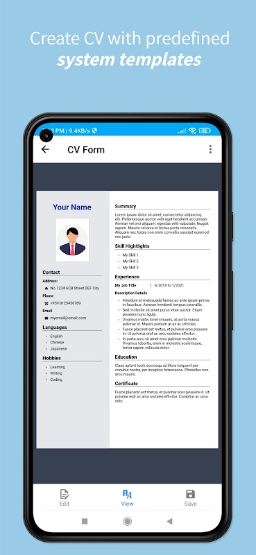 সিভি ক্রিয়েটর সিভি তৈরি করতে এবং পূর্বনির্ধারিত টেমপ্লেট এবং কাস্টম টেমপ্লেট সহ পুনরায় শুরু করতে।