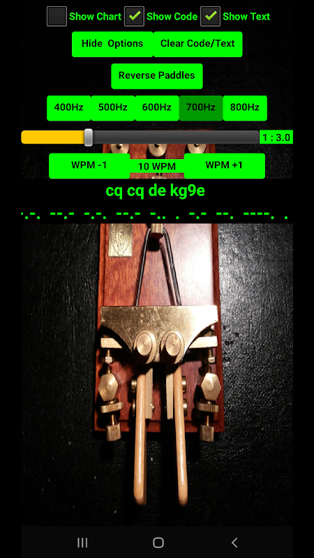 একটি সোজা লিভার অসিলেটর দিয়ে মোর্স কোড পাঠানোর অনুশীলন করুন। সেটিংসের মধ্যে রয়েছে WPM, মোর্স কোড/টেক্সট দেখান/লুকান, সাইডটোন 400Hz-800Hz বেছে নিন। WPM সামঞ্জস্য করুন যাতে আপনি একটি আরামদায়ক গতিতে সুগঠিত ডিআইটি এবং ডিএএইচ তৈরি করতে পারেন।