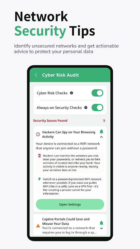 সম্ভাব্য সাইবার নিরাপত্তা ঝুঁকির জন্য আপনার ডিভাইস, Wi-Fi এবং সেলুলার সংযোগ সেটিংস পরীক্ষা করুন। আপনার নেটওয়ার্ক কনফিগারেশনগুলিকে শক্তিশালী করার জন্য বিশেষজ্ঞের টিপস পান, যা অননুমোদিত ব্যবহারকারীদের জন্য প্রবেশ করা কঠিন করে তোলে৷