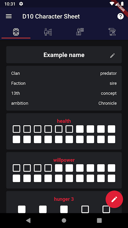 "D10 ক্যারেক্টার শীট" একজন খেলোয়াড় এবং একজন গল্পকার হিসাবে উভয়ই, আপনাকে তাত্ক্ষণিকভাবে বিভিন্ন অক্ষর শীট অ্যাক্সেস করতে দেয় যা আপনি আপনার সেশনের জন্য আগে প্রস্তুত করেছেন।