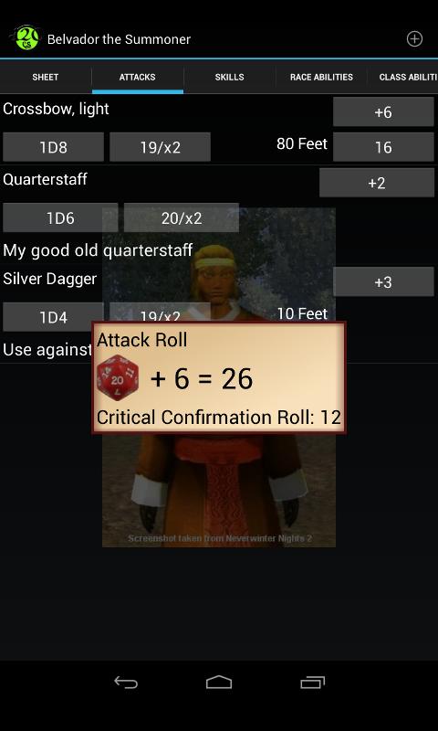 d20 ক্যারেক্টার শীট দুটি প্রধান অংশ নিয়ে গঠিত। আপনার চরিত্রের ট্র্যাক রাখার জন্য ক্যারেক্টার শীট, যা আপনি RPG খেলার সময় ব্যবহার করেন। আপনার চাহিদা অনুযায়ী গেম সেটিং কাস্টমাইজ করার জন্য প্রশাসন। সমর্থিত গেম সিস্টেম হল DnD 5e, DnD v.3.5। এবং পাথফাইন্ডার। একটি সম্পূর্ণ অনলাইন ম্যানুয়াল অন্তর্ভুক্ত: http://d20CharacterSheet.com/manual.html