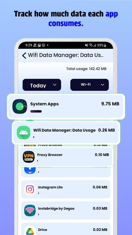 আপনার ডেটা ব্যবহার লাইভ ট্র্যাক করুন—মোবাইল ডেটা, ওয়াইফাই, বা উভয়ের মধ্যে স্যুইচ করা। এই উন্নত ডেটা ট্র্যাকার এবং ডেটা ব্যবহার বিশ্লেষক রিয়েল-টাইম পরিসংখ্যান এবং অ্যাপ-লেভেল ব্যবহার দেখায় যাতে ডেটা নির্ভুলতার সাথে ব্যবহার করে নিরীক্ষণ করা যায়।