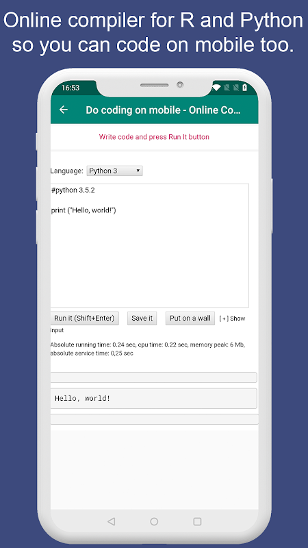মোবাইল ডিভাইসে অনলাইন সংকলক, আপনি মোবাইলে কোড লিখতে এবং আউটপুট দেখতে এটি চালাতে পারেন।