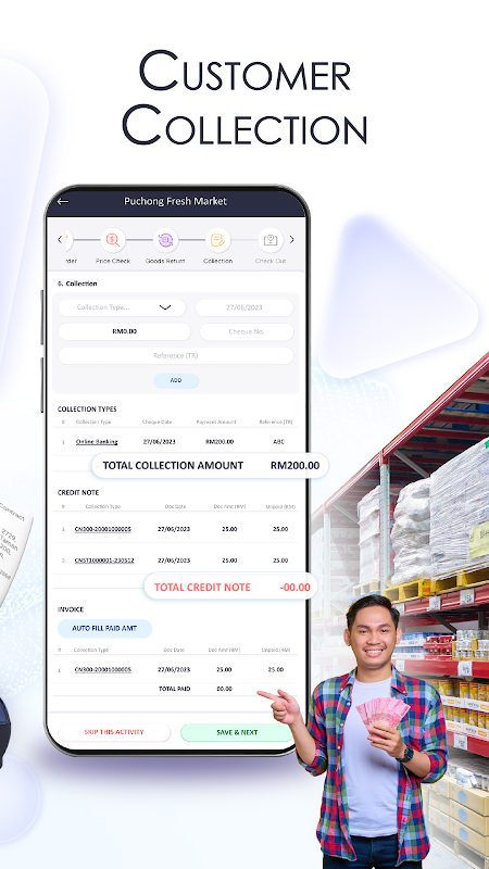 সংগ্রহ মডিউল গ্রাহকদের কাছ থেকে অর্থপ্রদান সংগ্রহকে সহজ করে। বিক্রয় প্রতিনিধিরা মোবাইল অ্যাপ ব্যবহার করে অর্থপ্রদানের বিশদ বিবরণ রেকর্ড করতে, চালান তৈরি করতে এবং বকেয়া অর্থপ্রদান ট্র্যাক করতে পারে। এই মডিউলটি ব্যবসাগুলিকে তাদের নগদ প্রবাহকে প্রবাহিত করতে এবং প্রাপ্য অ্যাকাউন্টগুলিকে কার্যকরভাবে পরিচালনা করতে সহায়তা করে।