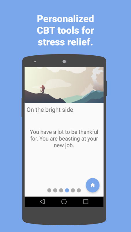 • Personalized Cognitive Behavioral Therapy tools to manage stress. Includes over 12 different CBT techniques to center you when you need it most such as distress scales, credit lists, deep breathing and relaxation, imagery techniques, self-care goals, and more.