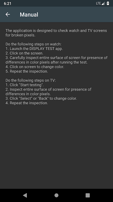 অ্যাপ্লিকেশনটি ভাঙা পিক্সেলগুলির জন্য ঘড়ি এবং টিভি পর্দা পরীক্ষা করার জন্য ডিজাইন করা হয়েছে।