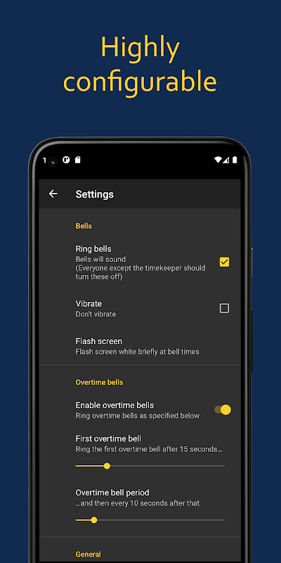 ডিবেটকিপারকে টাইমকিপিং থেকে ঝামেলা বের করতে দিন! এটি সঠিক সময়ে স্বয়ংক্রিয়ভাবে ঘণ্টা বাজবে, অথবা এটি কম্পন করতে পারে এবং/অথবা শান্ত ইঙ্গিত হিসাবে আপনার স্ক্রীন ফ্ল্যাশ করতে পারে, আপনাকে বিতর্কে আপনার মনোযোগ কেন্দ্রীভূত করতে দেয়।