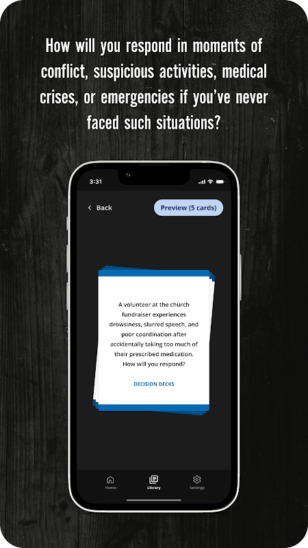নিরাপত্তা এবং নিরাপত্তা পরিস্থিতির জন্য আপনার পকেট-আকারের সিমুলেটর ডিসিশন ডেক উপস্থাপন করা হচ্ছে। আপনার সমালোচনামূলক চিন্তাভাবনা, রায় এবং সিদ্ধান্ত গ্রহণকে চ্যালেঞ্জ করার জন্য তৈরি করা হয়েছে, এই ডেকগুলি আপনাকে দ্বন্দ্ব এবং সংকট থেকে শুরু করে সন্দেহজনক ঘটনা এবং জীবন-হুমকির জরুরী অবস্থার বাস্তব-জীবনের পরিস্থিতিগুলির কেন্দ্রে ঠেলে দেয়। তারা গুরুত্বপূর্ণ প্রশ্ন জাহির আপনি কি করবেন? এবং আপনি কিভাবে প্রতিক্রিয়া করবেন?