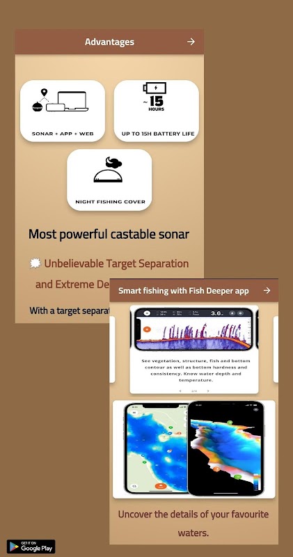 এছাড়াও, এই অ্যাপ্লিকেশনটিতে, আপনি সোনার হল একমাত্র কাস্টেবল ওয়াই-ফাই ফিশ ফাইন্ডারের স্পেসিফিকেশন পাবেন যেটি খারাপ আবহাওয়ার মধ্যেও শক্ত সংযোগের সাথে 394 ফুট পর্যন্ত কাস্ট করে। বহুমুখী। ওয়্যারলেস, কাস্টেবল এবং পোর্টেবল ফিশ ফাইন্ডার। নোনা জলে বা মিঠা জলে মাছ ধরার জন্য বা উপকূলে ব্যবহার করুন৷