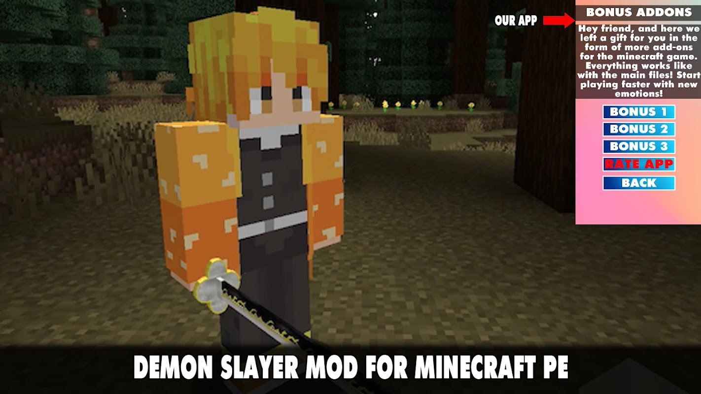 ❗❓ডিমন স্লেয়ার মোড মাইনক্রাফ্ট PE❗❓😋 ডেমন স্লেয়ার মোড একই নামের অ্যানিমে নিবেদিত। মাইনক্রাফ্টে মাঙ্গা চরিত্র, অস্ত্র, পোশাক এবং আরও অনেক কিছুর আকারে নতুন ভিড় থাকবে। অ্যাড-অনটি এমনকি মাল্টিপ্লেয়ারেও কাজ করবে, তাই আপনার বন্ধুদের কল করুন এবং ভিড়ের বিরুদ্ধে লড়াই করার জন্য নতুন ধরনের অস্ত্র দিয়ে নিজেকে সজ্জিত করুন।😋