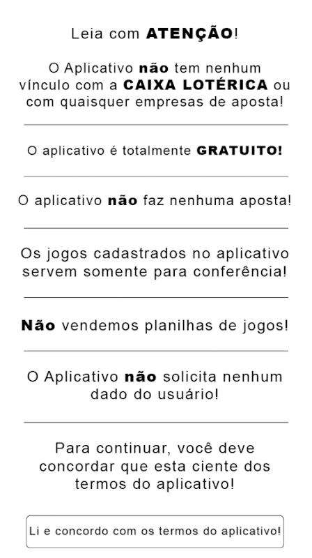 - O Aplicativo não tem nenhum vínculo com a CAIXA LOTÉRICA ou com quaisquer empresas de aposta!