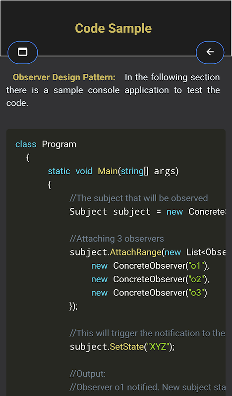 এই aplication সি # প্রোগ্রামিং ভাষা ডিজাইন প্যাটার্নস জন্য একটি মৌলিক এবং দ্রুত রেফারেন্স হিসেবে কাজ করবে। আপনি বিভাগ দ্বারা বিষয়বস্তু ফিল্টার করতে পারেন অথবা আপনি বিষয়, বিবরণ বা একটি নির্দিষ্ট কোডের উপর ভিত্তি করে কন্টেন্ট অনুসন্ধান করতে পারেন।