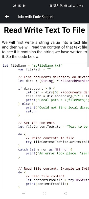 অ্যাপে অ্যান্ড্রয়েড বিকাশের জন্য জাভা কোড স্নিপেটস এবং আইওএস অ্যাপ্লিকেশন বিকাশের জন্য সুইফট কোড স্নিপেট রয়েছে।