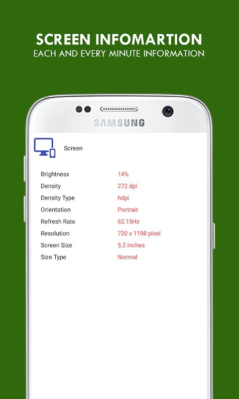 📱 Screen Information: Get all information related to the screen. Get display size or resolution, density unit, device display type, density type, and orientation. Know your screen type. Screen type, model and vendor. Check how much fingers are supported in the multi-touch test. Check the colors in LCD test.