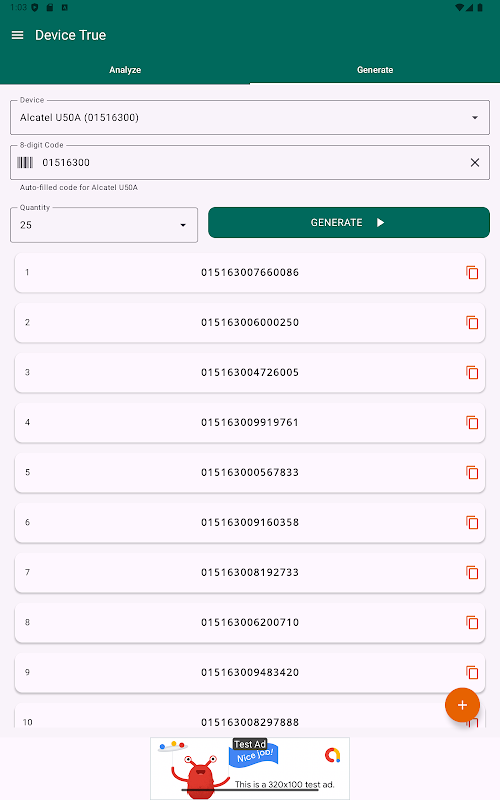 ✔ 'জেনারেটর' ট্যাবটি ফোন IMEI ট্যাবের একটি পরিপূরক। এই ট্যাবে আপনি যেকোনো ইচ্ছামত IMEI লিখতে পারেন (8 - 12 সংখ্যার মধ্যে) এবং এটি সম্পূর্ণ IMEI তৈরি করবে। তালিকায় শূন্য ডুপ্লিকেট থাকার নিশ্চয়তা রয়েছে।