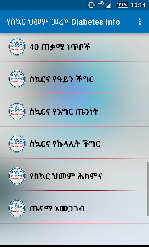 অ্যাপটিতে আমহারিক ভাষী ব্যক্তিদের জন্য ডায়াবেটিস মেলিটাস সম্পর্কে প্রাথমিক তথ্য রয়েছে। আপনি የስኳር የስኳር በሽታ ነው ?, ኢንሱሊን, አይነት 1 የስኳር የስኳር, አይነት 2 የስኳር ህመም, እርግዝናና የስኳር ህመም, ምልክቶች, ምርመራ, መከላከልና ማዘግየት, ህመም ህመም ህመም በኢትዮጲያ በኢትዮጲያ በኢትዮጲያ በኢትዮጲያ በኢትዮጲያ በኢትዮጲያ በኢትዮጲያ የስኳር የስኳር የስኳር የስኳር ህመም ህመም ህመም ህመም ህመም ህመም ህመም ህመም ህመም ህመም ህመም ህመም ህመም ህመም ህመም ህመም ህመም ህመም ህመም ህመም ህመም ህመም ህመም ህመም ህመም ህመም ህመም ህመም ህመም ህመም ህመም ህመም ህመም ህመም ህመም ህመም ህመም ህመም ህመም ህመም ህመም ህመም ህመም ህመም ህመም ህመም መዘዞች መዘዞች መዘዞች መዘዞች መዘዞች መዘዞች መዘዞች መዘዞች መዘዞች መዘዞች መዘዞች መዘዞች መዘዞች መዘዞች መዘዞች መዘዞች መዘዞች መዘዞች መዘዞች መዘዞች ድንገተኛ የስኳር ህመም, 40 ጠቃሚ ነጥቦች, ስኳርና የዓይን የኩላሊት የኩላሊት ፣ ስኳርና የእግር ጤንነት ጤንነት ፣ ህመም መዝገበ ቃላት ቃላት ቃላት ቃላት ቃላት ቃላት ቃላት ቃላት ቃላት ቃላት ቃላት ቃላት ቃላት ቃላት ቃላት ቃላት ቃላት