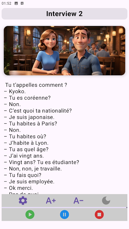 স্পষ্ট অডিও সহ সংক্ষিপ্ত, স্বাভাবিক এবং পঠনযোগ্য কথোপকথন সহ আপনার ফ্রেঞ্চ (লেভেল A1) উন্নত করুন। নতুনদের জন্য আদর্শ, মৌলিক ব্যাকরণ পর্যালোচনা করা এবং আপনার শ্রবণ বোঝার উন্নতি... এমনকি অফলাইনেও।