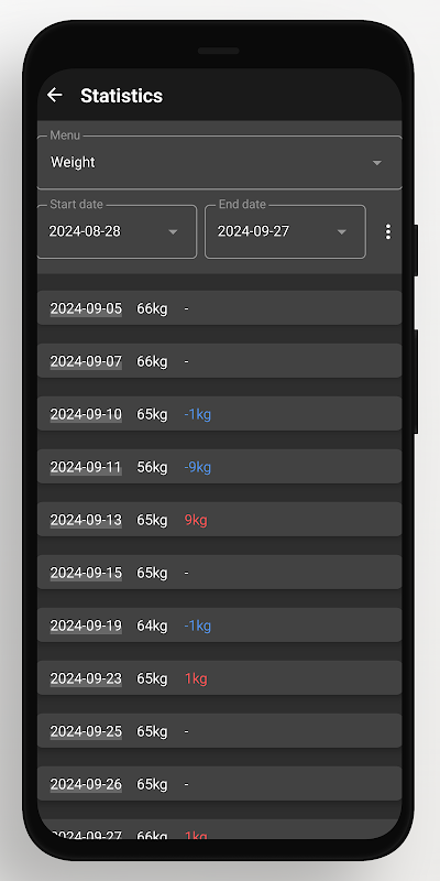 • আপনি আপনার ওজন, ব্যায়াম, ডায়েট (সকালের নাস্তা, দুপুরের খাবার, রাতের খাবার), গভীর রাতের খাবার এবং মদ্যপান রেকর্ড ও পরিচালনা করতে পারেন এবং পরিসংখ্যান পরীক্ষা করতে পারেন।