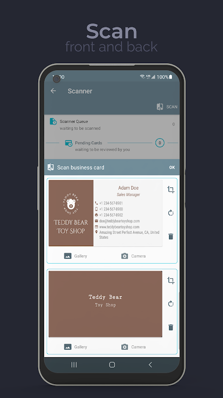 স্ক্যান তৈরি এবং শুধুমাত্র এক অ্যাপ্লিকেশন দিয়ে ব্যবসায়িক কার্ড শেয়ার করুন।