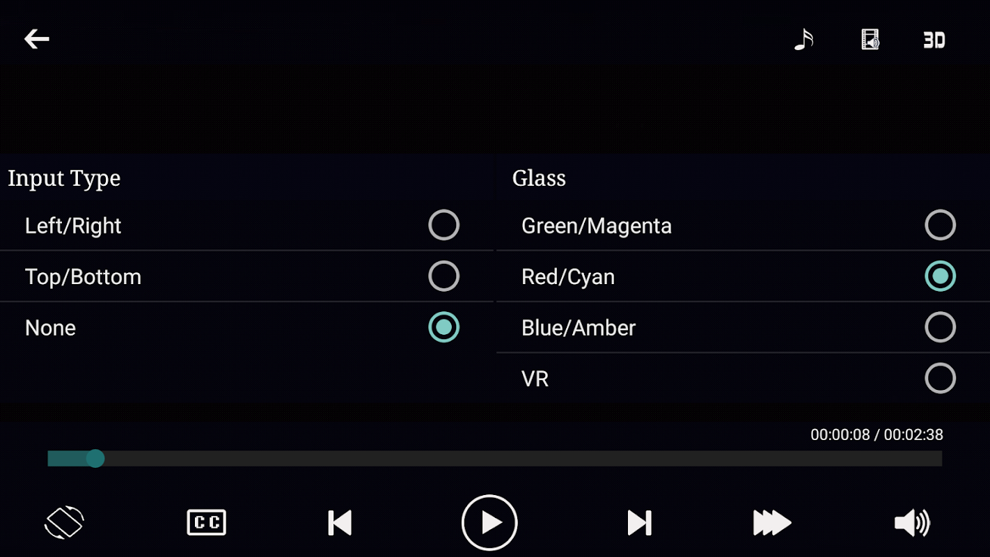 3D ভিডিও প্লেয়ার লাল / সায়ান 3D গ্লাস সাথে দেখার জন্য রেড সায়ান 3D থেকে ঘনদর্শনমূলক 3D কন্টেন্ট পরিবর্তন করে।