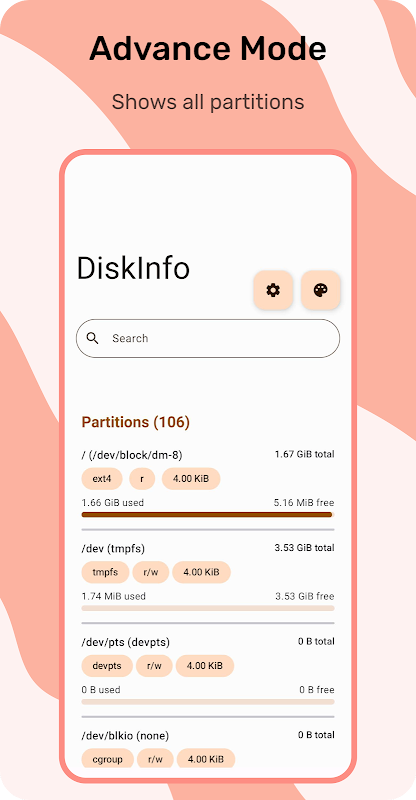 DiskInfo আপনার ডিভাইসের পার্টিশন তালিকাভুক্ত করার জন্য একটি সহজ অ্যাপ। (প্রাথমিক নির্মাণ)