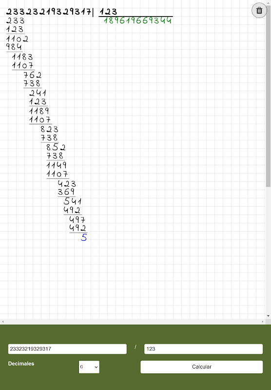 অ্যাপ্লিকেশনটি আপনাকে ভাগফল এবং একটি বিভাগের অবশিষ্টাংশ খুঁজে পেতে অনুমতি দেয় এবং একটি ভার্চুয়াল নোটবুকে দৃশ্যত ফলাফলটি দেখায়।