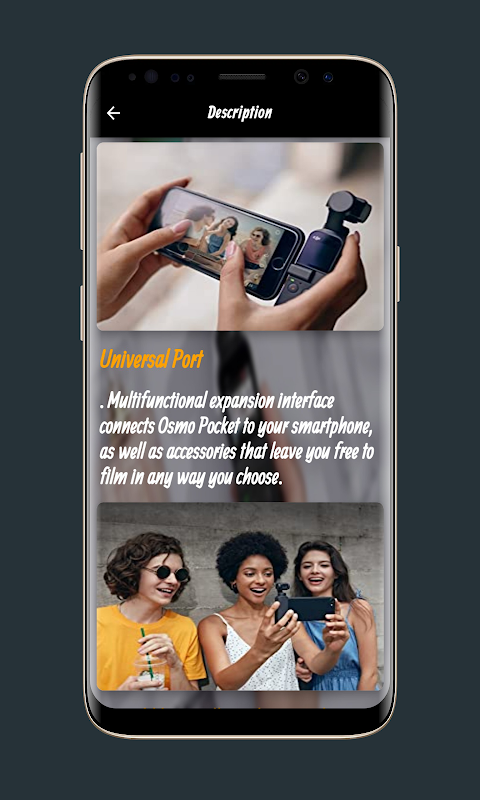 DJI Osmo পকেট গাইড অ্যাপটিতে DJI Osmo পকেটের অনেক তথ্য এবং বৈশিষ্ট্য রয়েছে যা আপনি স্পষ্টভাবে এবং সহজেই পেতে পারেন। DJI Osmo Pocket Guide অ্যাপের মাধ্যমে, আপনি DJI Osmo Pocket-এর একটি ভিডিও দেখতে পারেন, যা আপনাকে DJI Osmo পকেট গাইডের চেহারা এবং বৈশিষ্ট্যগুলি সম্পর্কে জানার সুযোগ দেয় এতে আশ্চর্যজনকভাবে শক্তিশালী পারফরম্যান্স সহ বিভিন্ন বৈশিষ্ট্য রয়েছে: The OSMO পকেট আশ্চর্যজনক বিস্তারিতভাবে ছবি ক্যাপচার, ধন্যবাদ 1/2. 3-ইঞ্চি সেন্সর, 80° FOV, এবং F/2.0 অ্যাপারচার। এটি প্রতিবার শেয়ার করার যোগ্য শটগুলির জন্য 1.55µm পিক্সেল আকারের সাথে 100Mbps এ 4K/60fps ভিডিও এবং 12MP ফটোগুলিও শুট করতে পারে।