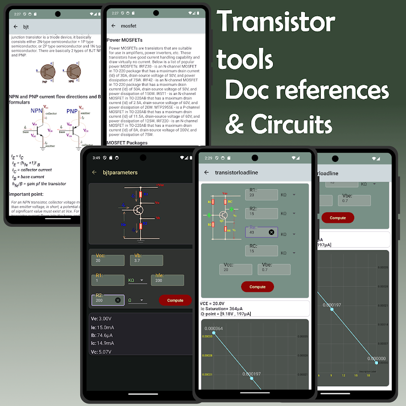আমাদের ব্যাপক অ্যাপের মাধ্যমে ইলেকট্রনিক্সের বিশ্ব আবিষ্কার করুন! ট্রানজিস্টর, ডায়োড, ক্যাপাসিটর, ফ্লিপ ফ্লপ, আইসি এবং আরও অনেক কিছু সহ জনপ্রিয় ইলেকট্রনিক উপাদানগুলির বিস্তারিত বিবরণে অ্যাক্সেস পান। আমাদের অ্যাপটি আরও ভালভাবে বোঝার জন্য ইলেকট্রনিক্স সার্কিট নথিগুলির একটি বিশাল সংগ্রহ অন্তর্ভুক্ত করে। প্রতিরোধক ক্যালকুলেটর, ইন্ডাক্টর ডিজাইন ক্যালকুলেটর, ফিল্টার ডিজাইন ক্যালকুলেটর, 555 টাইমার ক্যালকুলেটর এবং আরও অনেক কিছু সহ আমাদের উন্নত ক্যালকুলেটর টুল ব্যবহার করে সহজে সার্কিট গণনাগুলি সমাধান করুন৷ শান্ত পয়েন্ট প্লট বৈশিষ্ট্যের সাথে আপনার পরিবর্ধক ডিজাইনগুলিকে কল্পনা করুন এবং সহজেই বাটারওয়ার্থ ফিল্টারগুলি ডিজাইন করুন৷ আপনি একজন ছাত্র, শৌখিন বা পেশাদার হোন না কেন, আমাদের অ্যাপটি আপনার ইলেকট্রনিক্স চাহিদার জন্য নিখুঁত টুল।