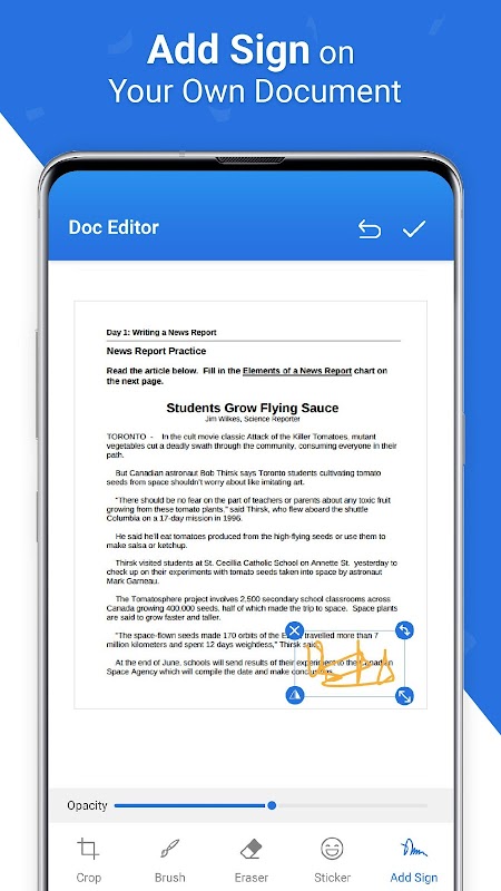 - দস্তাবেজ সম্পাদক: আকার পরিবর্তন করুন, স্টিকার যোগ করুন, হাইটলাইট, মুছুন