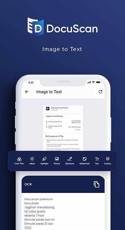 DocuScan এছাড়াও একটি অপটিক্যাল ক্যারেক্টার রিকগনিশন (OCR) বৈশিষ্ট্য দিয়ে সজ্জিত করা হয়েছে যাতে স্ক্যান করা ইমেজ/ফটোতে থাকা টেক্সট শনাক্ত করা যায় এবং এটিকে TXT-এ রূপান্তর করা হয়।