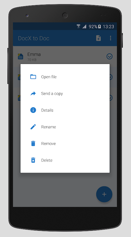 আপনি একটি মাইক্রোসফট অফিস ডক ফাইল প্রয়োজন হলে, DOCX না, যা আরো প্রচলিত হয়ে উঠছে, .doc থেকে .docx রূপান্তর করার জন্য এই অ্যাপ্লিকেশন ব্যবহার. কিছু টেক্সট এডিটর বা অ্যাপস .doc বিন্যাস সঙ্গে ভাল কাজ করে. আপনার DOCX ডকুমেন্ট পাবেন এবং ডক রূপান্তরকারী DOCX সঙ্গে এটি নির্বাচন করুন. রূপান্তর স্বয়ংক্রিয়ভাবে শুরু হবে. সদ্য রূপান্তরিত ফাইল তারপর আপনার অ্যানড্রইড ডিভাইস থেকে ডাউনলোড করা হবে.