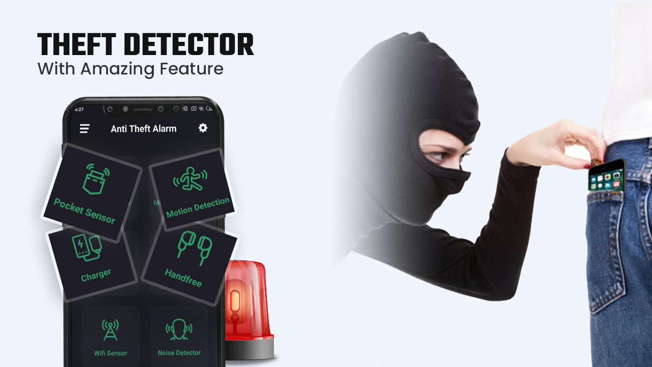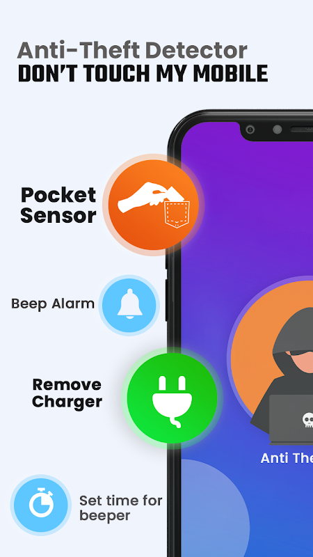 আপনার ফোনকে উন্নত চুরি-বিরোধী বৈশিষ্ট্যগুলির সাথে সুরক্ষিত করুন যেমন: প্রক্সিমিটি সনাক্তকরণ, গতি সনাক্তকরণ, সম্পূর্ণ ব্যাটারি অ্যালার্ম, চার্জার সংযোগ বিচ্ছিন্ন, ওয়াইফাই সংযোগ বিচ্ছিন্ন, হ্যান্ডসফ্রি সংযোগ বিচ্ছিন্ন, পকেট চুরি অ্যালার্ম।