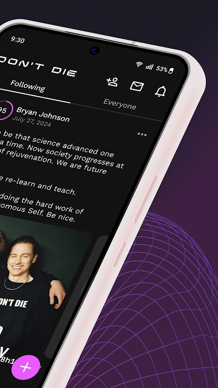 দ্য ডোন্ট ডাই অ্যাপ হল একটি সামাজিক স্বাস্থ্য অ্যাপ যা ব্রায়ান জনসন এবং তার দল ব্লুপ্রিন্টে তৈরি করেছে। আমাদের লক্ষ্য হল মৃত্যু এবং এর কারণগুলির বিরুদ্ধে যুদ্ধ করা এবং ডোন্ট ডাই অ্যাপটি "ডন ডাই" গেমটি একসাথে এবং পৃথকভাবে খেলার জন্য একটি প্ল্যাটফর্ম প্রদান করে। অ্যাপের সাথে আমাদের লক্ষ্য হল: