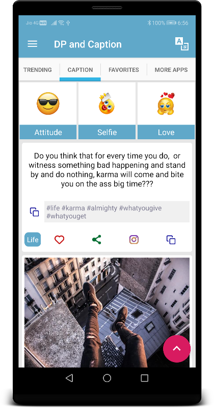 First app on play store to provide DP and Caption in a single app. DP and Caption app contains awesome DP and Caption to copy, download and share with friends on any social media profile like WhatsApp