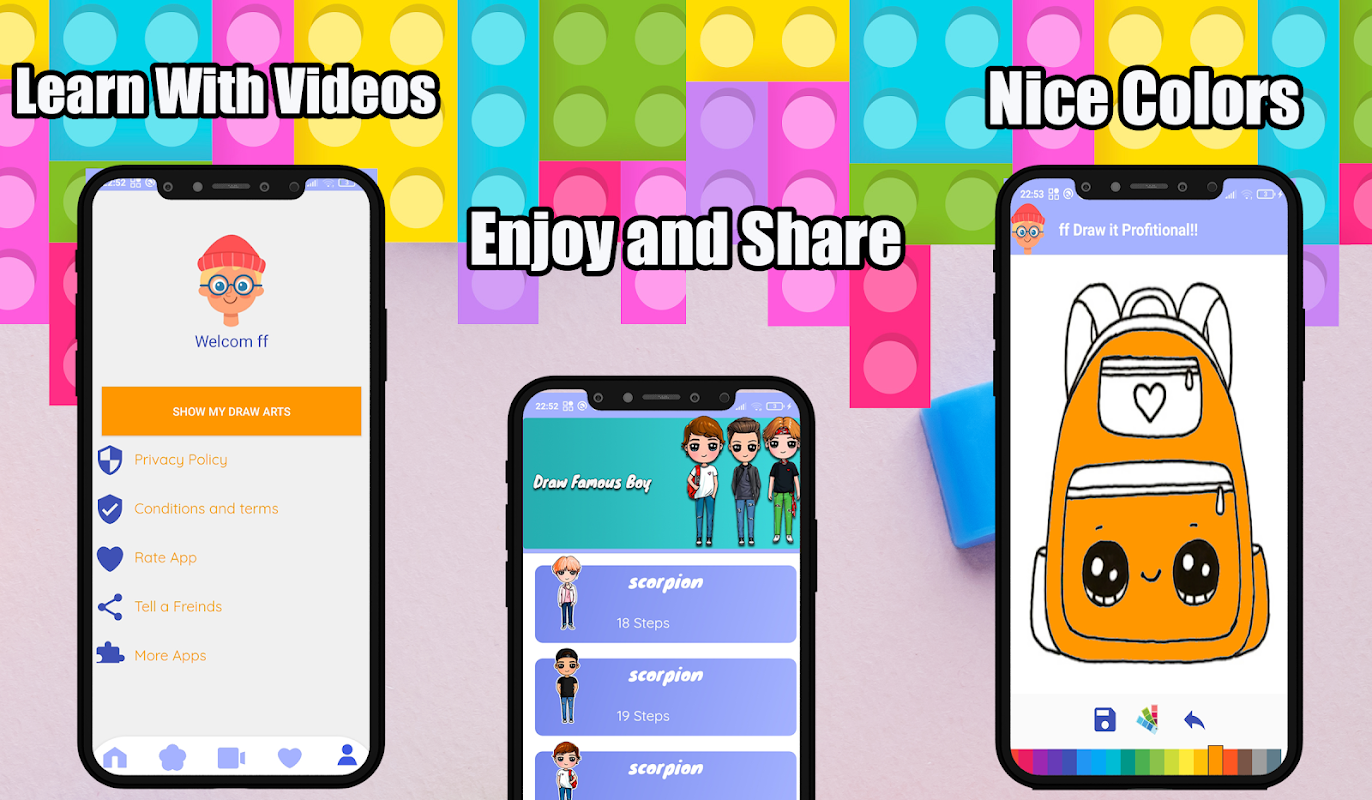 The goal of the application is an educational goal to the extent that it gives you a solution to the problem of "how to draw" develop your drawing skills. You can learn how to draw cartoon characters , draw food and draw Game Characters , fast food, Funny Cartoons ,draw drinks, draw Ocean Animals & Farm Animals, draw dessert and Cartoon People , Draw Special Occasions you can also draw Cute Famous Drawing and Halloween Drawing and Funny Food .