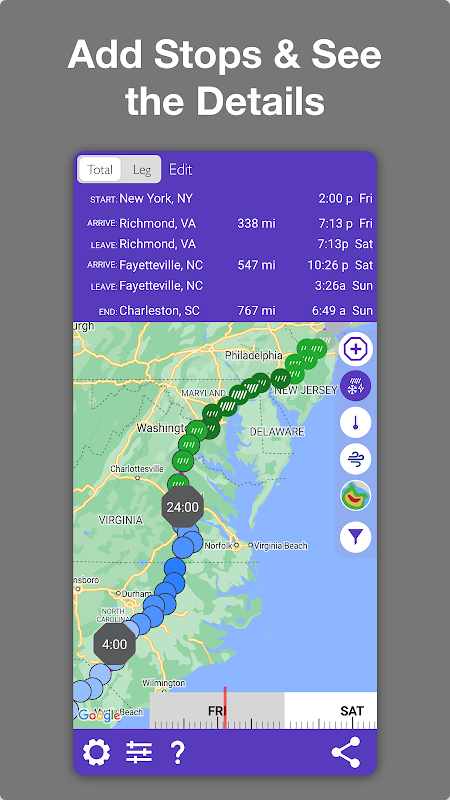 • আপনার ভ্রমণের সময়ের উপর ভিত্তি করে রুটের আবহাওয়ার পূর্বাভাস