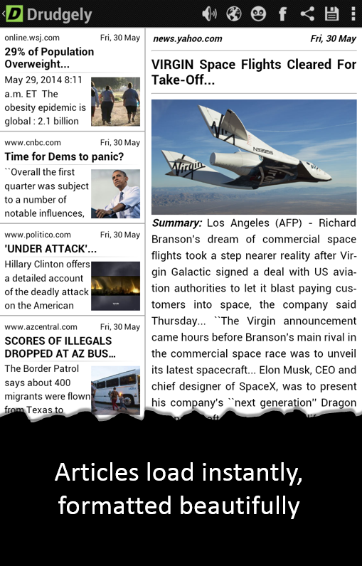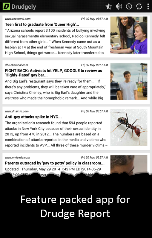Drudge Report on steroids! Drudgely for Drudge Report is simply the most powerful and feature packed app for Drudge Report (www.drudgereport.com) on Android phones and tablets. Drudgely has many advanced features such as summarization, reader mode, text to speech, offline reading and translation that take the Drudge Report experience to the next level. Drudgely is optimized for both phones and tablets (especially 7" and 10" tablets like Nexus 7 and Nexus 10), with a list layout for phones and optional grid and tile layouts for tablets, similar to Flipboard or Google Currents.