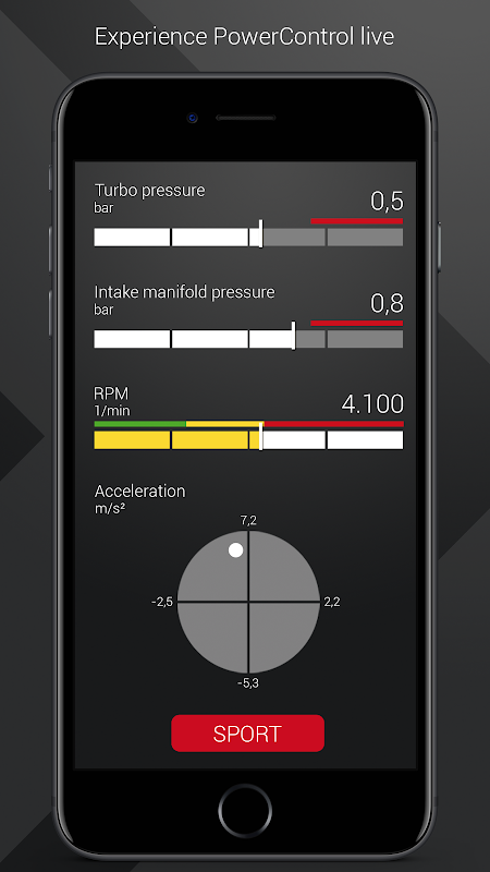 নতুন PowerControl অ্যাপ্লিকেশন দিয়ে আপনি বন্ধ আপনার টিউনিং চালু এবং এবং 3 প্রোগ্রাম আউট আপনার ইঞ্জিন এর পারফরম্যান্সের নির্বাচন করতে পারেন। উপরন্তু, আপনি লাইভ খেলাধুলা উপকরণ প্যানেল আপনার ইঞ্জিনের সব চাবি কর্মক্ষমতা তথ্য দেখতে পারেন। নিরাপদ আকর্ষণ সঙ্গে সর্বোচ্চ ত্বরণ জন্য - উদ্ভাবনী অ্যাকসিলরোমিটারটির আপনি জি-বাহিনী যে পার্শ্বত এবং longitudinally আপনার গাড়ীর প্রভাবিত দেখায়।