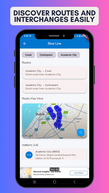 স্মার্ট রুট ফাইন্ডার: দুবাই মেট্রো নেটওয়ার্কে যেকোনো দুটি স্টেশনের মধ্যে দ্রুততম রুট খুঁজুন — স্থানান্তর হাইলাইট এবং আনুমানিক স্থানান্তর গণনা সহ।