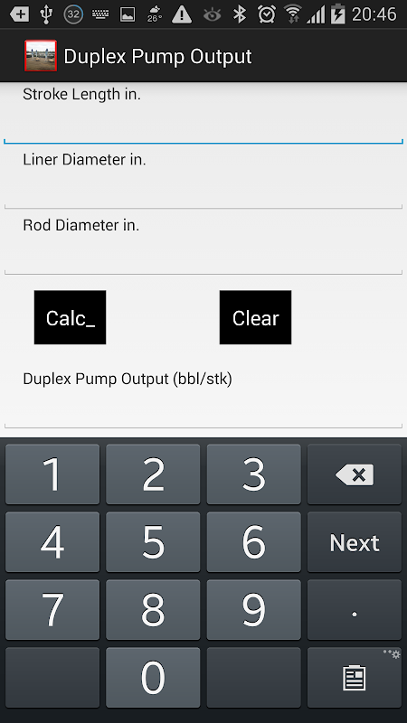 This app calculates the pump output bbls/stk for a duplex pump