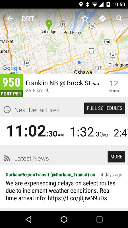 এই অ্যাপটি বাসের সময়সূচির পাশাপাশি টুইটারে @Durham_Transit-এর সর্বশেষ খবর প্রদান করে।