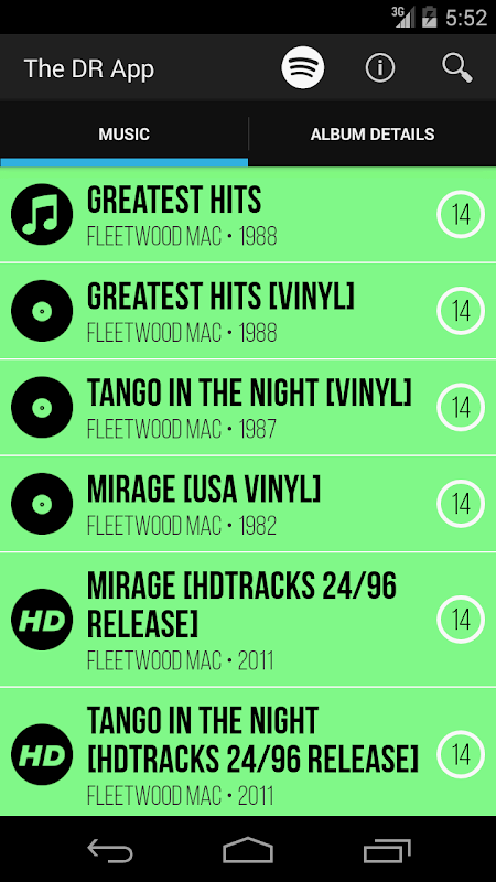 ডায়নামিক রেঞ্জ অ্যাপ একটি ফ্রি অডিও আবেদন. এর ফলে অ্যাপ্লিকেশন আপনি একজন শিল্পী বা অ্যালবাম সবচেয়ে গতিশীল মুক্তির জন্য অনুসন্ধান করতে পারবেন. এটা যেমন বিশেষ একধরনের প্লাস্টিক, সিডি, FLAC, MP3 টি, মাল্টি চ্যানেল, ও HD ট্র্যাক ইত্যাদি রিলিজ সব ধরণের সমর্থন আবেদন স্বয়ংক্রিয়ভাবে প্রদর্শন করা হয় এবং ক্রম সাজানো দ্বারা সর্বোচ্চ স্কোর (সেরা ডায়নামিক রেঞ্জ) সঙ্গে রিলিজ অসুস্থ. নির্দিষ্ট অ্যালবাম বিস্তারিত তালিকা একটি অ্যালবাম লঘুপাত দ্বারা দেখানো যেতে পারে.
