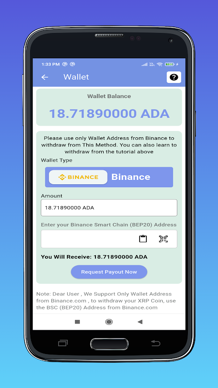 এই অ্যাপে, আপনি কিছু গেম খেলতে পারেন এবং কিছু অল্প পরিমাণে অ্যাডা (কার্ডানো) কয়েন সংগ্রহ করতে পারেন, যা আপনি আপনার Binance বা FaucetPay ওয়ালেটে পরিশোধ করতে পারেন যখন আপনি কয়েনের ন্যূনতম প্রয়োজনীয় পরিমাণ পূরণ করেন।