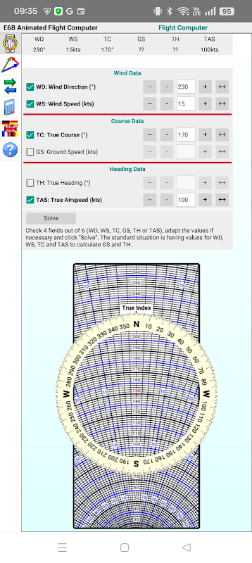 এই অ্যাপটি আপনাকে ছয়টির মধ্যে চারটি মান (তিনটি গতি এবং তিনটি কোণ) প্রবেশ করানোর এবং বাকি দুটি গণনা করার সুযোগ দিয়ে একটি বায়ু ত্রিভুজ সমাধান করে। এরপর এটি ধাপে ধাপে ব্যাখ্যা করে যে আপনি একটি অ্যানিমেটেড ফ্লাইট কম্পিউটার ব্যবহার করে কীভাবে সমাধান পাবেন, প্রতিটি ধাপ কীভাবে সম্পাদন করতে হবে তা দেখায়: অ্যানিমেশনটি ডিস্কটি ঘোরায়, এটি স্লাইড করে এবং চিহ্ন যোগ করে। এটি সমাধানের দিকে প্রতিটি ধাপের জন্য প্রদত্ত মানগুলির মধ্যে কোনটি ব্যবহার করতে হবে তাও দেখায়।