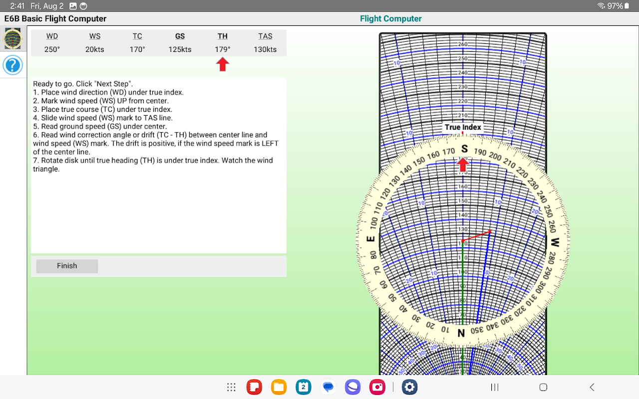এই অ্যাপটি আপনাকে ছয়টি (তিনটি গতি এবং তিনটি কোণ) এর মধ্যে চারটি মান প্রবেশ করিয়ে এবং বাকি দুটিটি গণনা করে একটি বায়ু ত্রিভুজ সমাধান করে। এরপরে এটি ব্যাখ্যা করে যে কীভাবে আপনি ফ্লাইট কম্পিউটারের সাথে এনিমেট করে এই ফলাফলগুলি পান by এটি ডিস্কটি ঘোরায়, এটিকে স্লাইড করে এবং চিহ্নগুলি যুক্ত করে। এটি সমাধানের প্রতি পদক্ষেপের জন্য কী মান ব্যবহার করতে হবে তাও দেখায়।