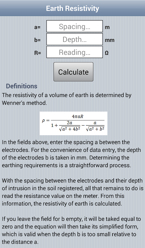 বিশাল এলাকা জন্য, একটি একক পরিমাপ যথেষ্ট নয়. আপনি বিভিন্ন electrodes ফাঁক (ক) এ বিভিন্ন পরিমাপ তৈরি করা হবে. এই বিভাগে যে তর্ক উপর গড় মাটি resistivity গণনা করা হবে. আপনি যে কোনো অনুক্রমে তথ্য প্রবেশ করতে হবে না এবং আপনি উপর থেকে শুরু করতে হবে না এবং আপনি খালি সারি চলে যাবে: অ্যাপ্লিকেশন আপনার ইনপুট বুঝতে যত্ন নেয়.