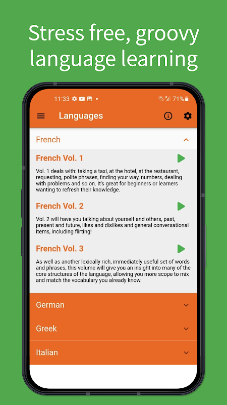 স্প্যানিশ, ফরাসী, ইংরেজি, জার্মান, ইতালিয়ান এবং অন্যান্য অন্যান্য ভাষা শিখুন এবং সঙ্গীতটির শক্তি ব্যবহার করে আপনার শব্দভান্ডার এবং ব্যাকরণ উন্নত করুন। ইয়ারওয়ার্সগুলি সহজেই ভাষা কোর্সের সাহায্যে আপনার মাথায় একটি বিদেশী ভাষার শব্দ রোপণ করে।